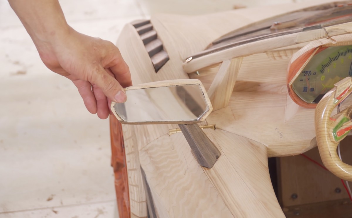 Teď nastavuje boční zrcátko s dřevěným rámem a dokončuje další realistický detail interiéru vozu