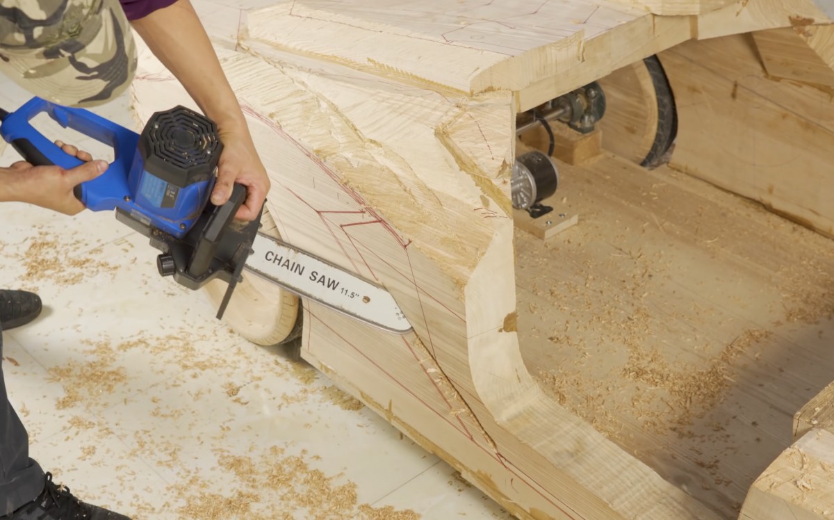 Zde řetězovou pilou vyřezává boční profil karoserie podle předkreslených linií a postupně tvaruje spodní část dveří