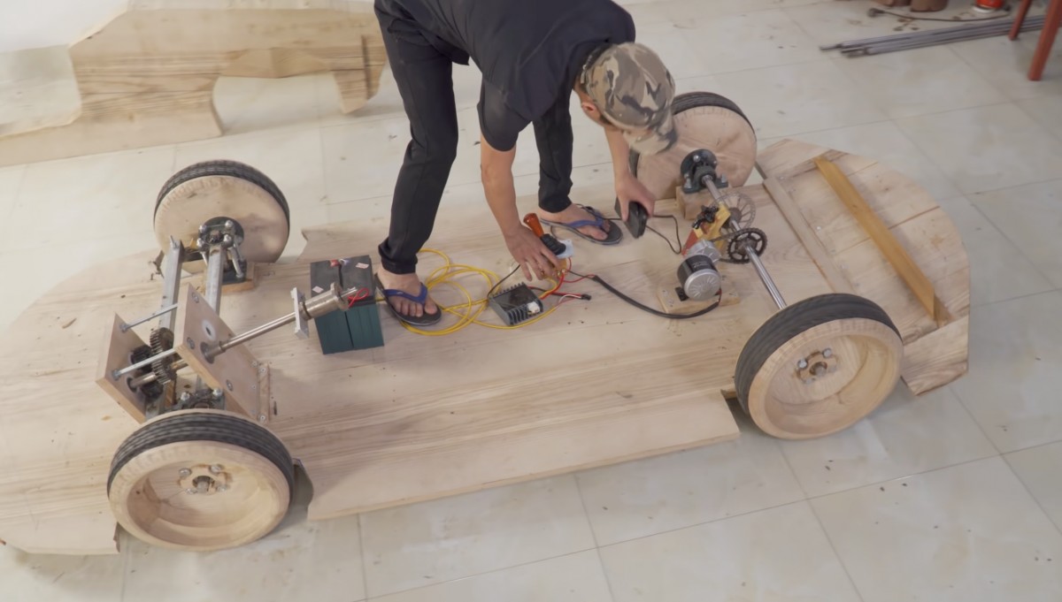 Zde zapojuje baterii k motoru a řídicí jednotce a testuje funkčnost elektrického pohonu na hotovém podvozku