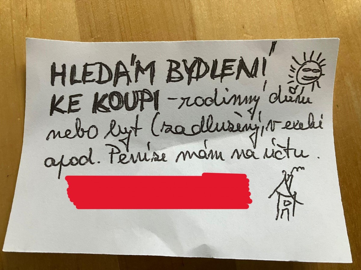 Obyčejný letáček, který vypadá, jako by ho někdo právě sesmolil na kuchyňském stole a vlastnoručně roznesl do schránek v jedné konkrétní lokalitě, kde si vysnil bydlení