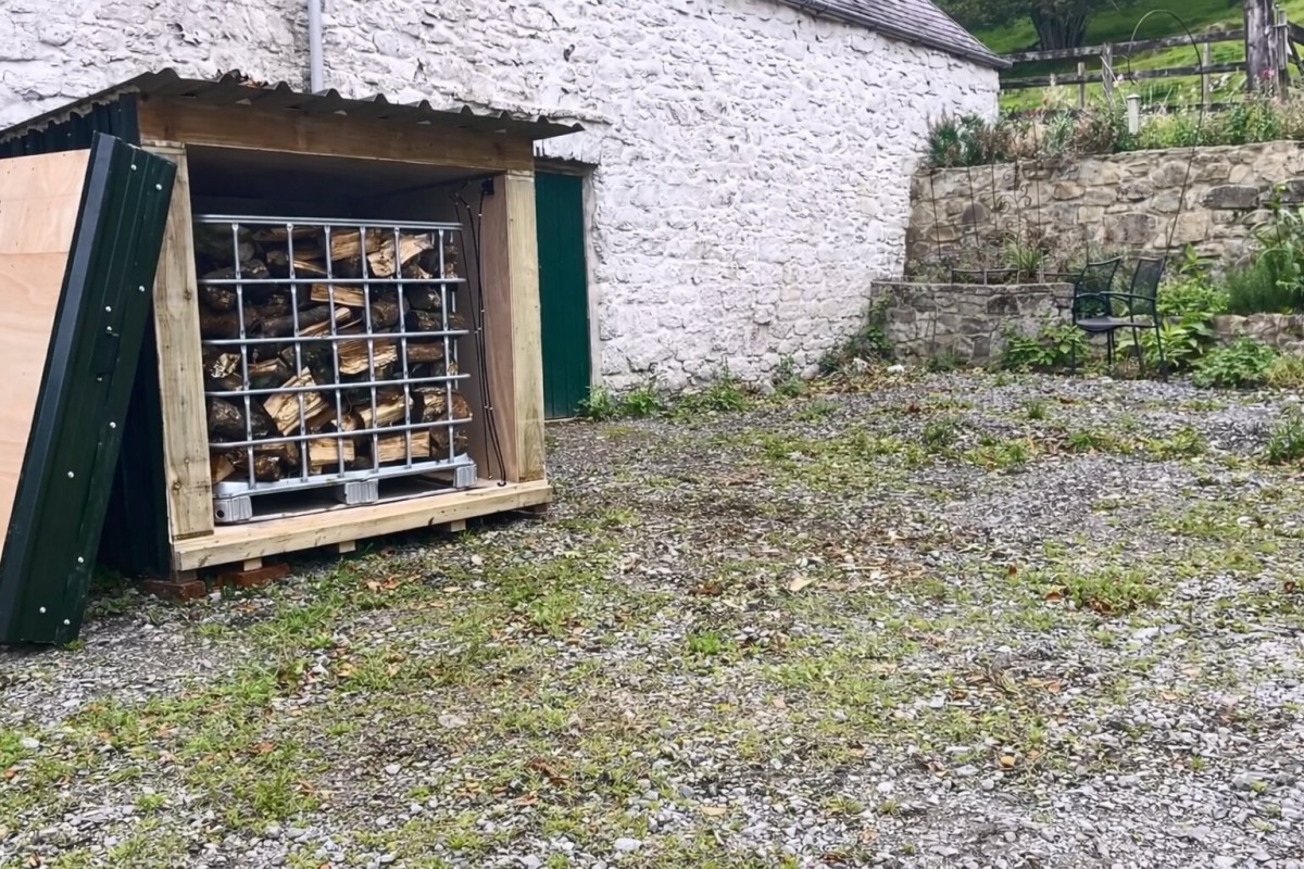 Pohled do otevřené sušárny palivového dřeva, kterou si vyrobil kutil svépomocí z levných komponent