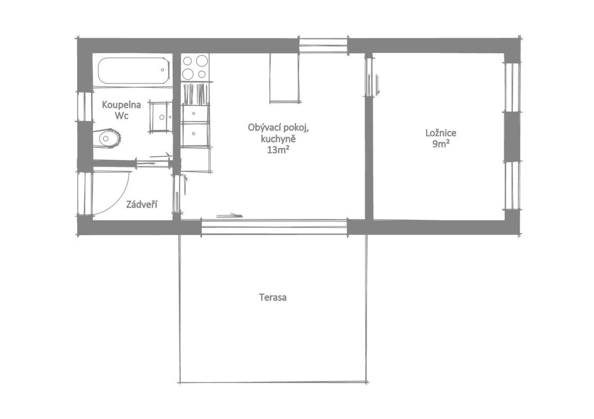 Půdorys modulového domku, který byl postaven na zahradě u rodinného domu pro maminku, aby nebydlela sama