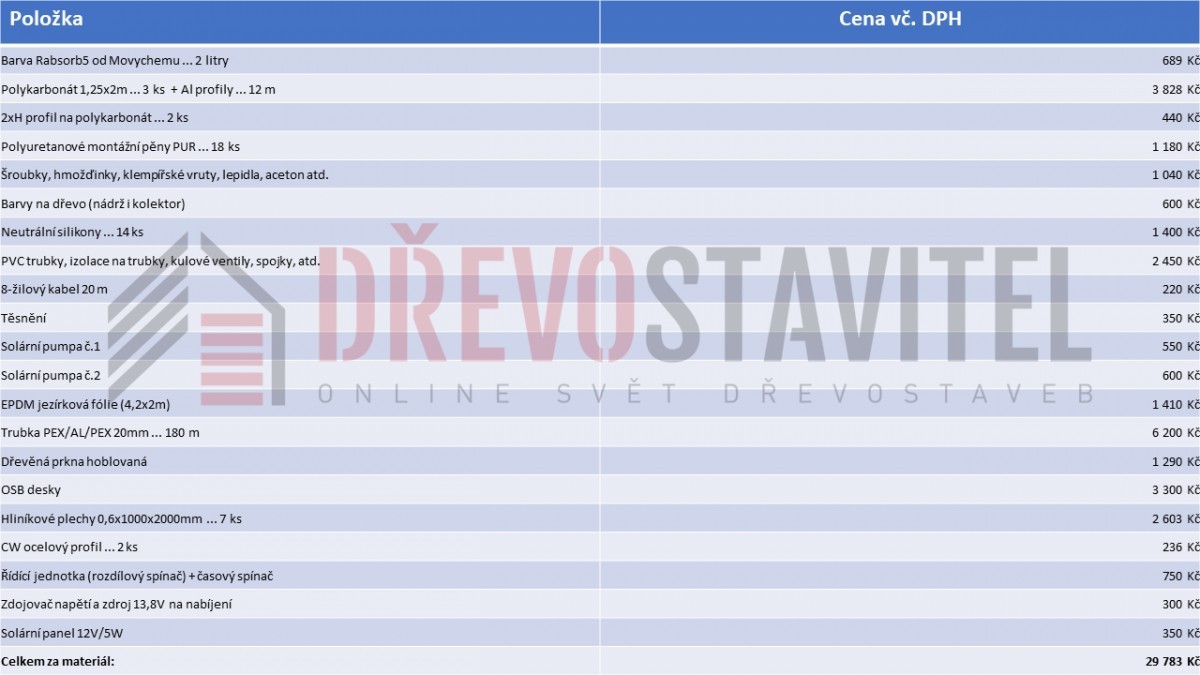 Soupis veškerého materiálu potřebného na výrobu solárního systému svépomocí + ceny