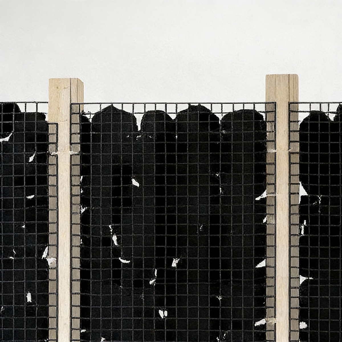 Konstrukce je vytvořena ze dřeva a mezi sítě jsou vloženy na černo natřené kameny, které sálají teplo do místnosti