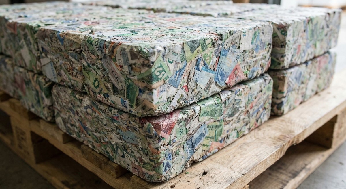 Brikety ze slisovaných bankovek, které slouží k topení v kamnech místo dřeva