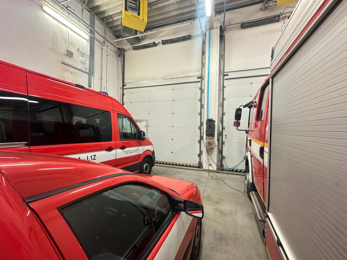 Hasiči parkují zásahová vozidla v garážích stanice tak, aby mohli vyjet bez zdržení. Vozidla stojí připravená u výjezdových vrat a jsou napojena na technické zázemí potřebné pro okamžitý zásah