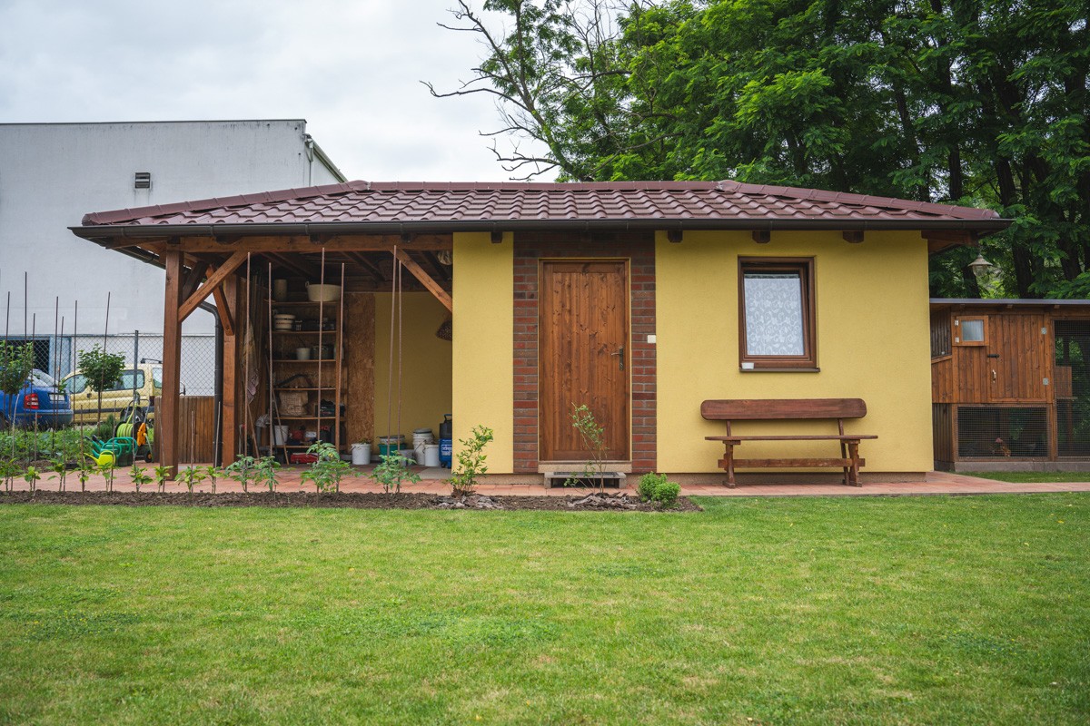 Zahradní domek je také dřevostavba a majitel ho stavěl svépomocí s kamarády