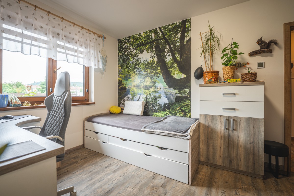 Krásná přírodní tapeta oživuje a zútulňuje prostor, pokoj má 12,3 m2