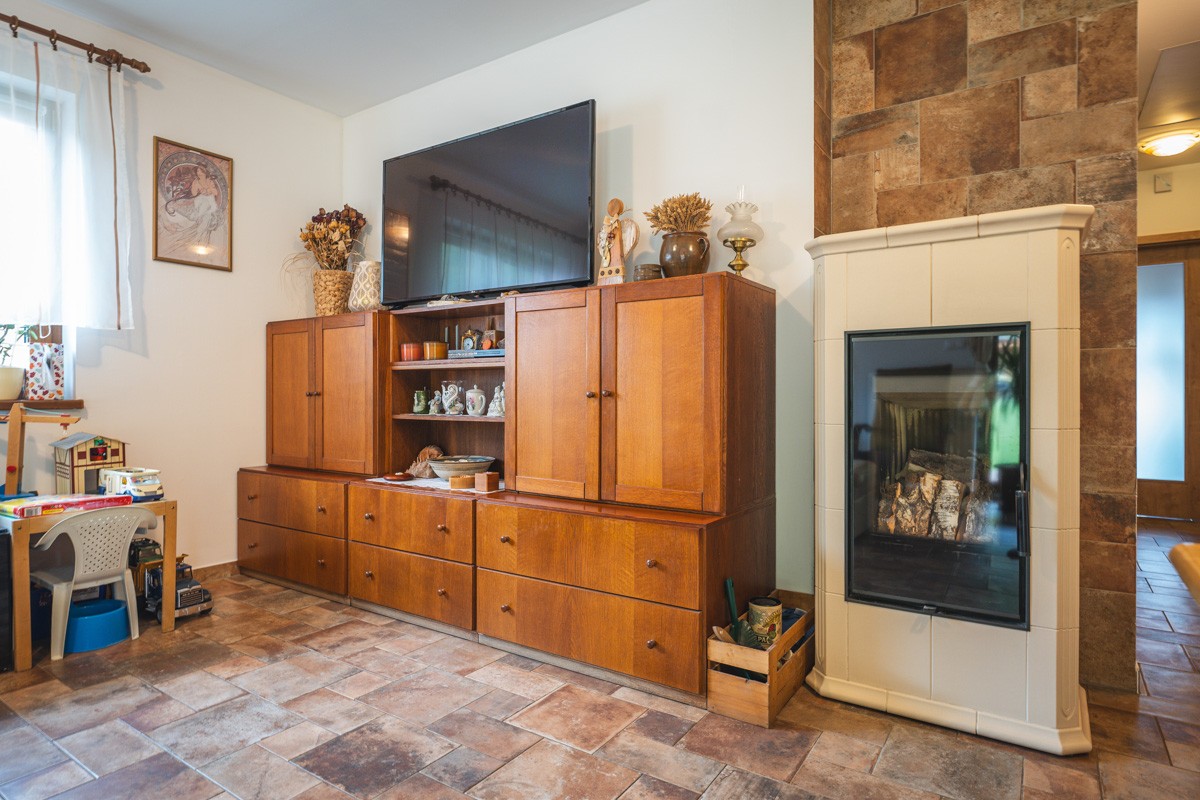 Obývací stěnu si majitelé přenesli z předchozího bytu, kamna jsou ale nová