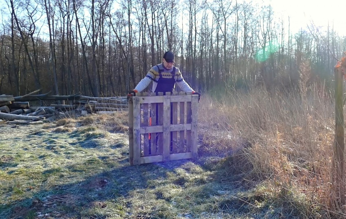 Přinášení první palety pro základ budoucí Holzmiete. Ta zajistí nutnou mezeru od země a zamezí vzlínání vlhkosti