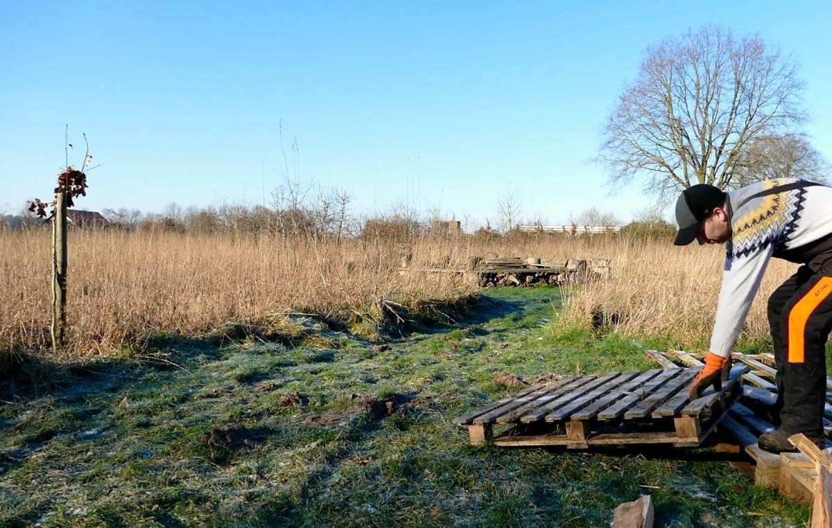 Přinášení další palety k rozšíření podkladu. Mezerami bude zespodu neustále nasáván čerstvý vítr pro komínový efekt