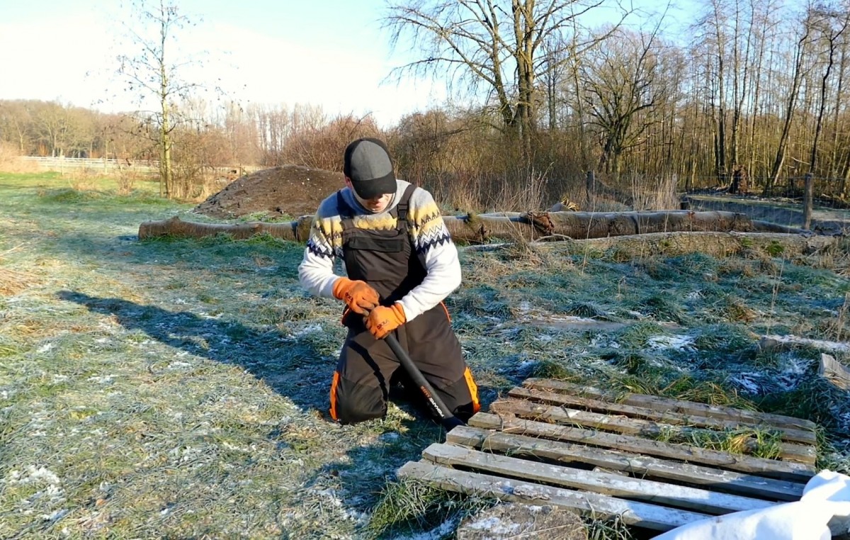 Nástup se sekerou k úpravě palet. Příprava plochy pro obvodovou zeď vyžaduje pečlivost hned od první minuty