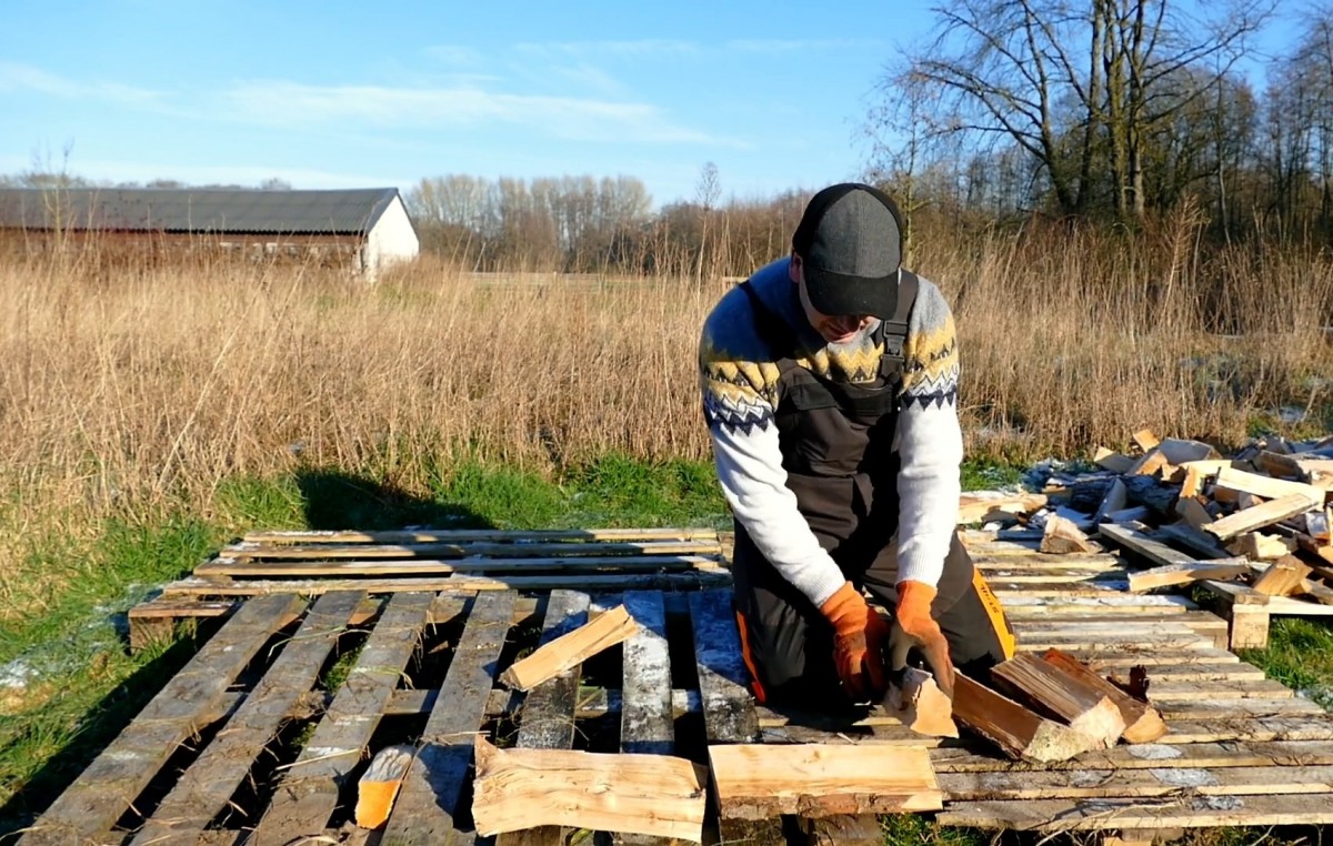 Pokládání prvních polen na palety tvoří základ budoucí obvodové zdi. Dřevo je správně odděleno od země pro zamezení vzlínání vlhkosti