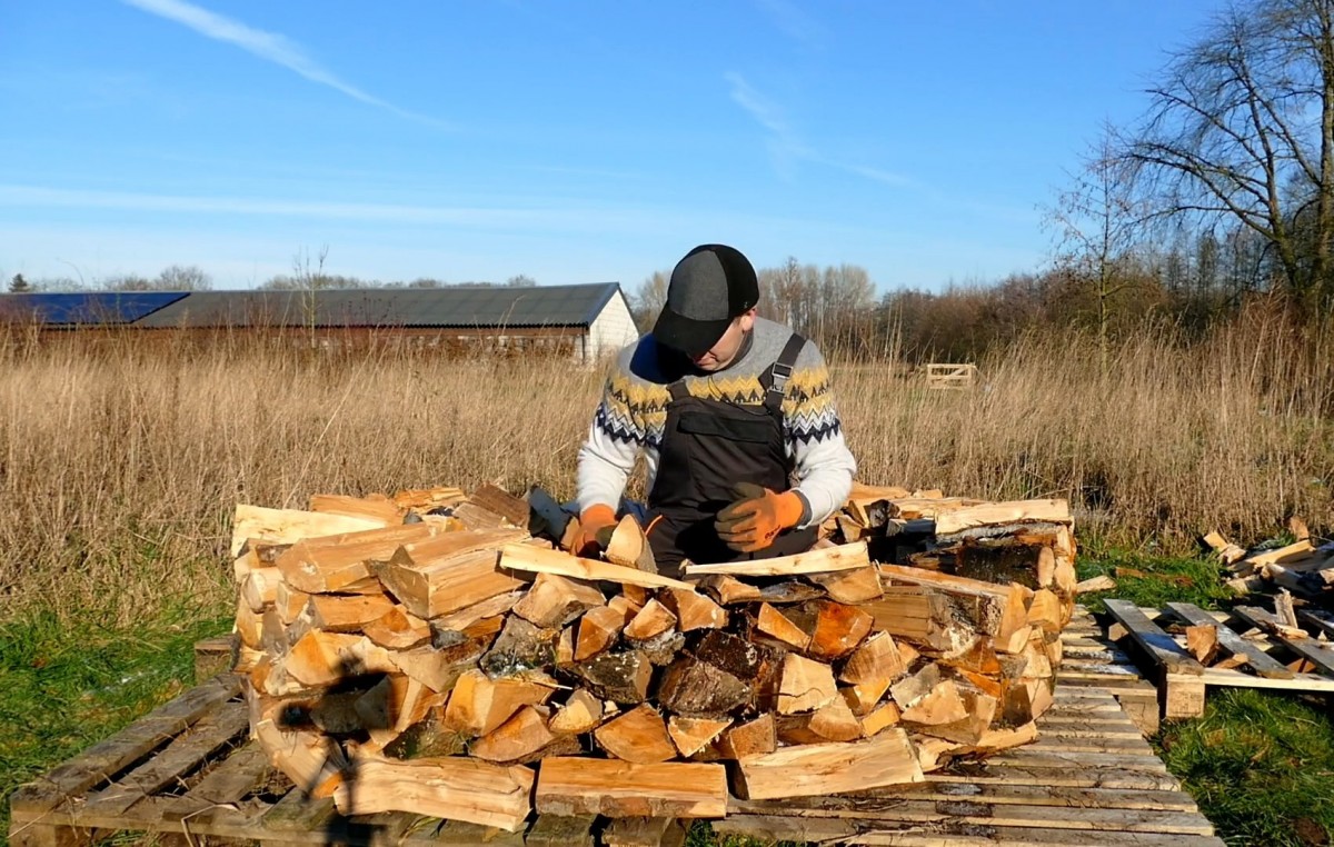 Přikládání dalších štípaných polen. Konstrukce díky vzdušnému základu může neustále volně dýchat