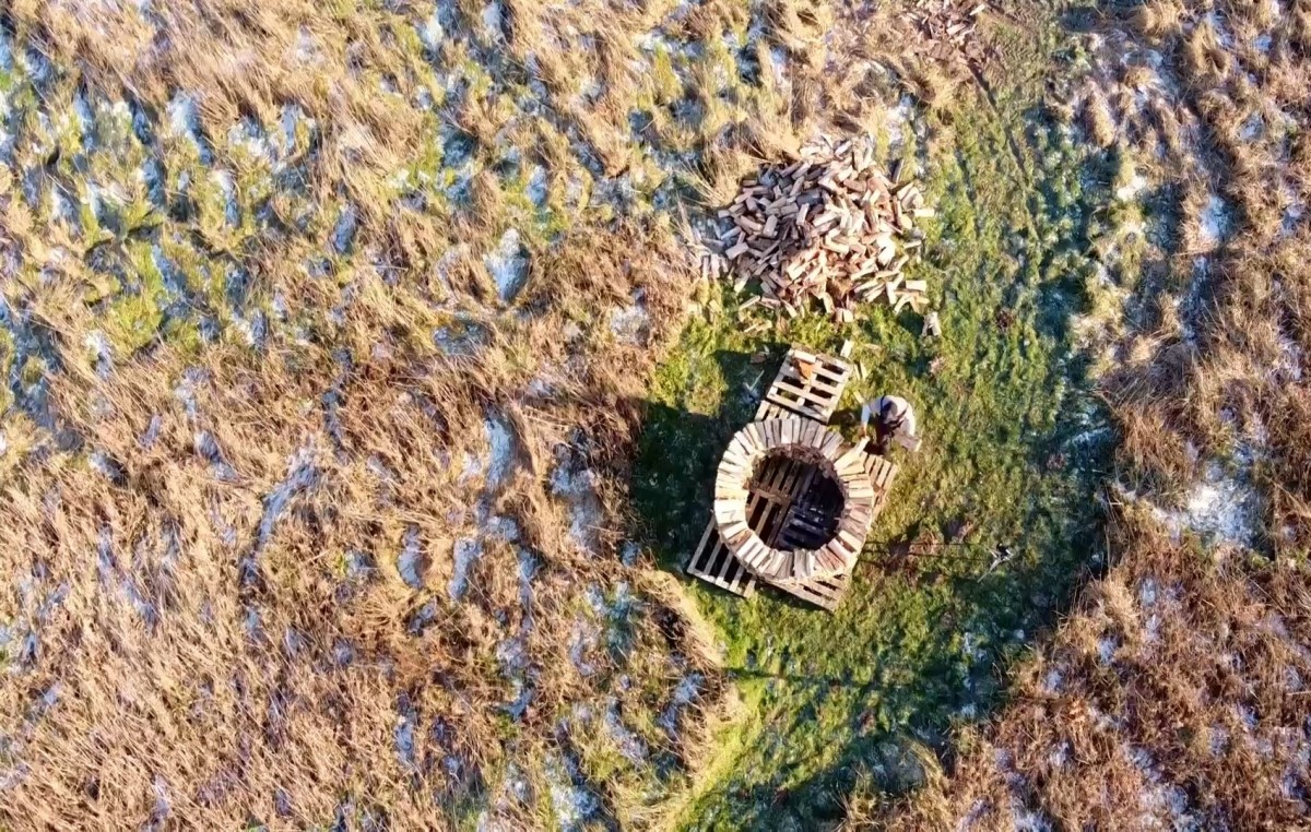 Kruhové skládání dřeva při pohledu shora. Udržet přesný poloměr a dokonalý kruh bez měření od středové osy je pro statiku velmi riskantní