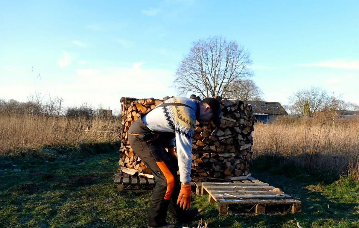 Manipulace se dřevem. Pro dokonalou stavbu Holzmiete je potřeba neustále pečlivě třídit rovná polena od těch sukatých a křivých