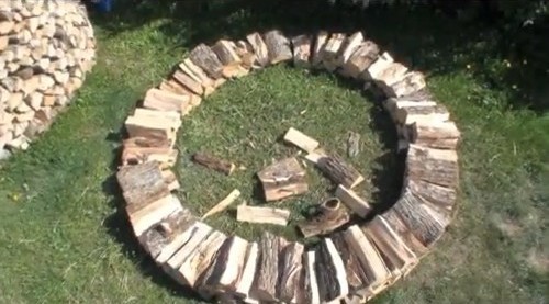 Začátek stavby nové homole položením polen do kruhu. Zde je velká chyba: chybí podkladový rošt, polena leží přímo na trávě a kvůli vzlínání vlhkosti začnou brzy hnít