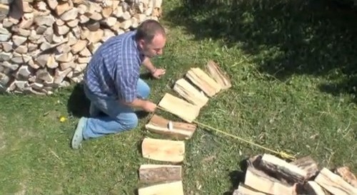 Muž vyměřuje vzdálenost pro skládání dřeva pomocí provázku. Je to ukázkový příklad vytyčení přesného středu pro udržení dokonalého kruhu