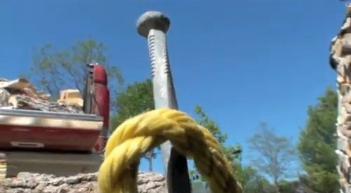 Detail kolíku zapíchnutého pevně doprostřed budoucí stavby. Od tohoto bodu se následně odvíjí dokonalá geometrie celé Holzmiete