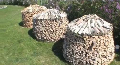 Pohled na tři hotové a precizně zakončené Holzmiete. Krásně se od výšky metru a půl zužují do tvaru kužele, takže tvoří svůj vlastní ochranný plášť
