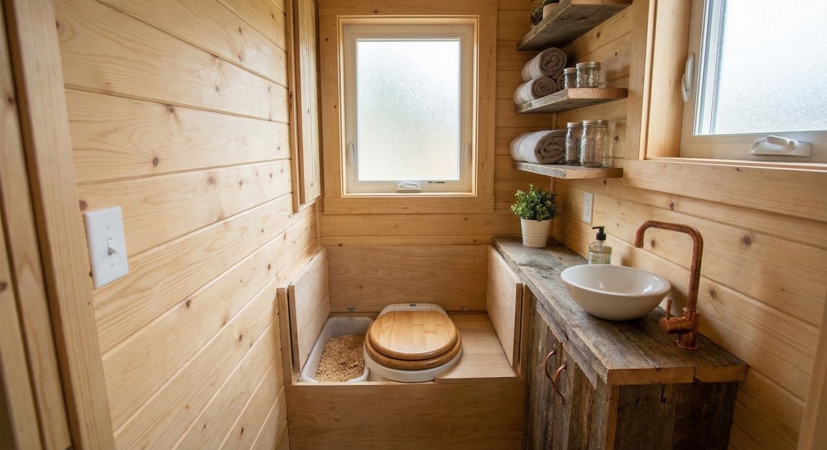 Takto vypadá záchod a koupelna v mobilním domku. V podstatě je to podobné jako v obytném voze