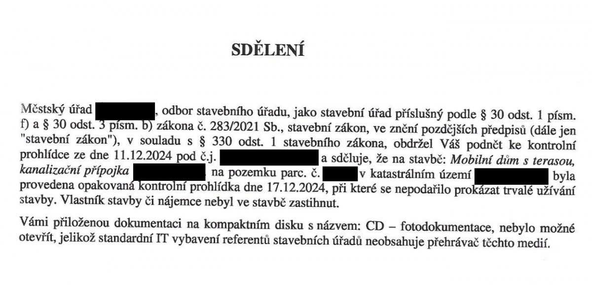 Úřad uvádí, že při kontrolní prohlídce se nepodařilo prokázat užívání stavby, přestože podle dalších podkladů měla být využívána k bydlení