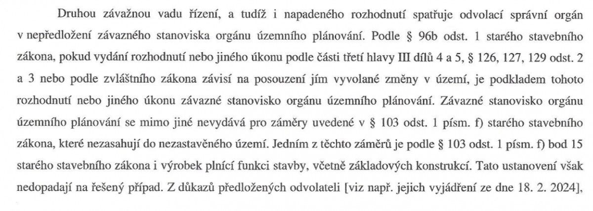 Odvolací orgán označuje za závažnou vadu chybějící stanovisko územního plánování, bez kterého podle něj nemělo být rozhodnutí vůbec vydáno