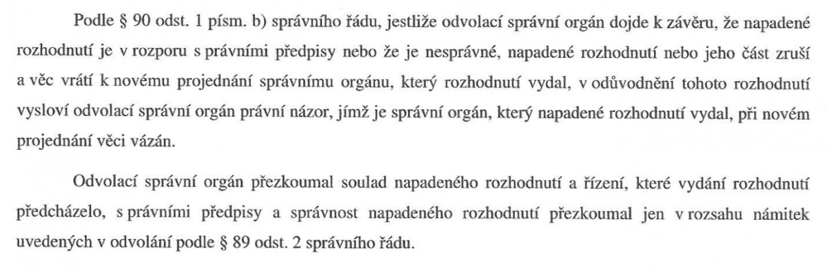 Odvolací orgán vysvětluje, že v případě rozporu se zákonem může rozhodnutí zrušit a vrátit k novému projednání, čímž potvrzuje zásadní chyby v řízení