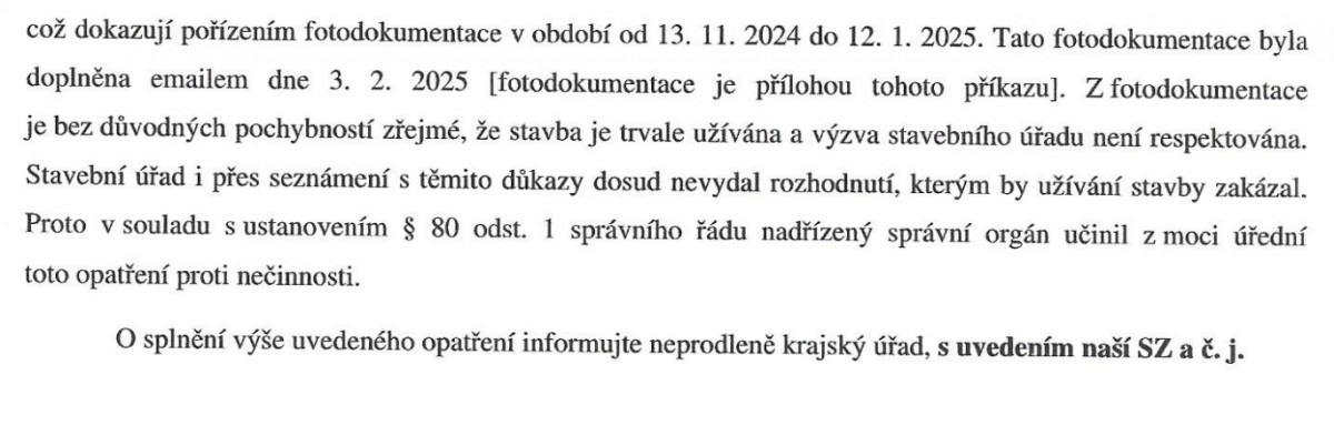 Z dokumentu vyplývá, že fotodokumentace prokazovala užívání stavby, přesto úřad nevydal rozhodnutí, což vedlo k zásahu nadřízeného orgánu