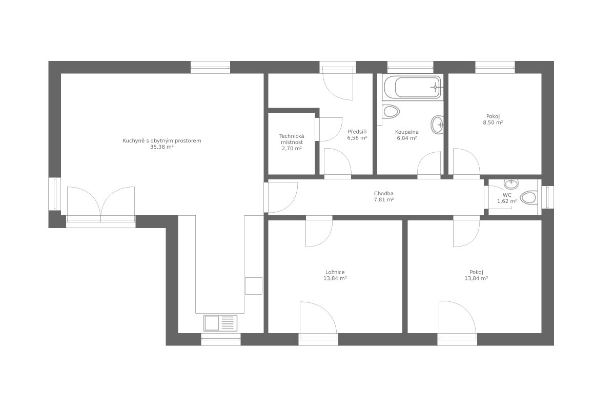 Projdete-li hlavními dveřmi domu, ocitnete se v moderní, netradičně řešené předsíni. Ve výklenku po pravé straně je menší botník s prostorem na sezení a větší zrcadlo. Naopak na levé straně jsou chytře navržené skříně pro odkládání kabátů a bund. Odtud vedou dveře do technické místnosti a do chodby, ze které se následně dostanete do všech ostatních pokojů. Pokud byste se vydali doleva, dostanete se do koupelny, dětského pokoje, pokoje pro hosty a na samostatné WC. Naopak naproti vám bude ložnice a po vaší pravé straně hlavní obytná místnost s kuchyní a jídelnou. Pokud byste si chtěli prohlédnout celý půdorys, klikněte zde.