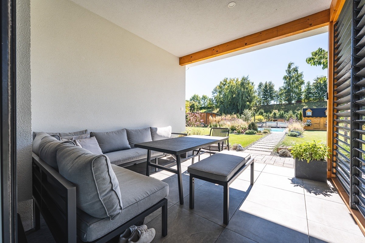 Pergolu mají majitelé řešenou pomocí nosného trámu, který vychází přímo ze stěny domu