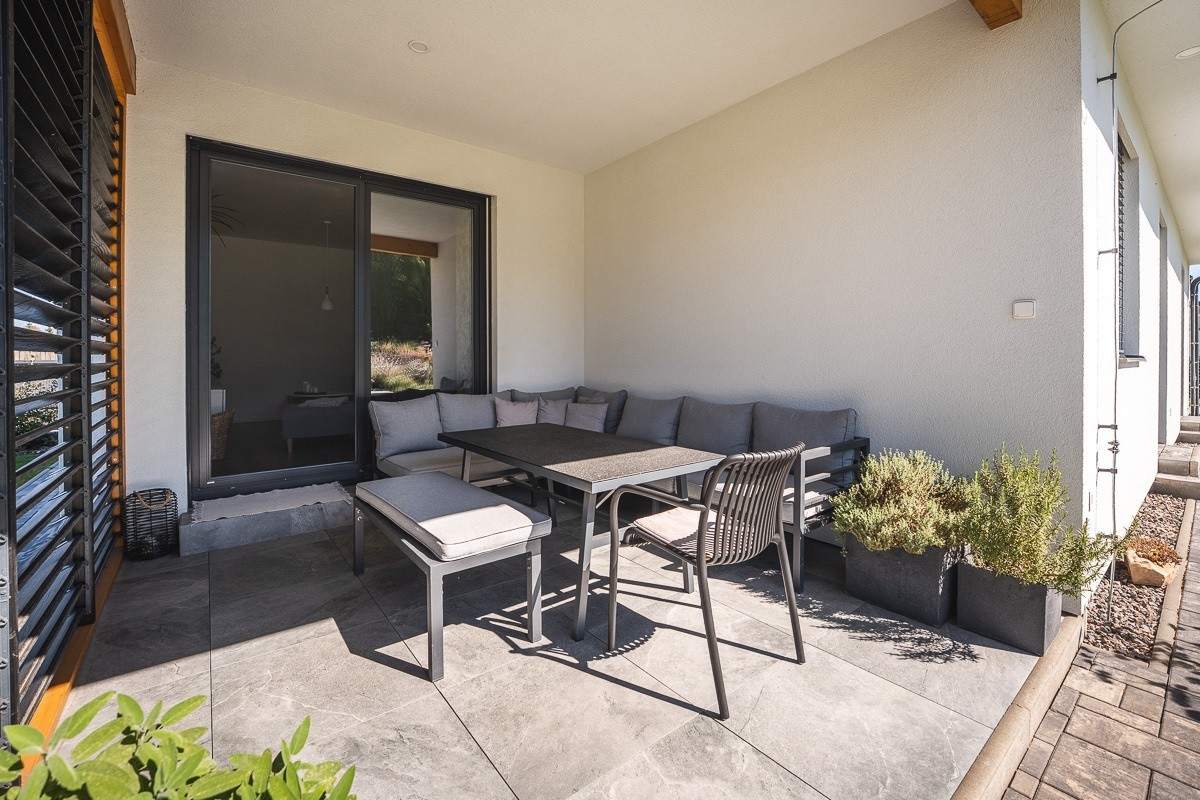 Venkovní posezení mají manželé ve stínu s krásným výhledem na celou zahradu