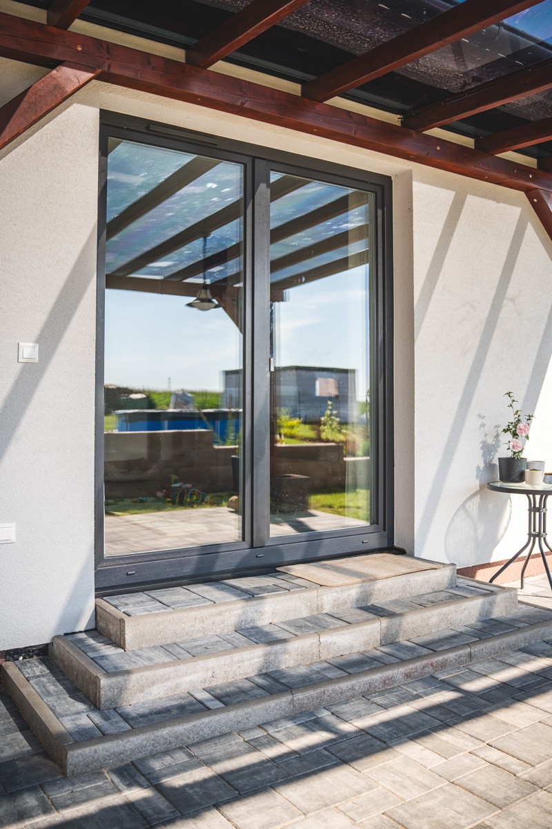 Z obývacího pokoje vedou balkonové dveře přímo na nové venkovní posezení