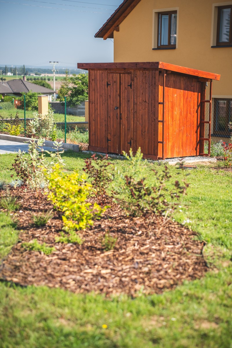 Na zahradě si majitelé svépomocí postavili dvě kůlničky. Jedna je z plechu a druhá ze dřeva a slouží na uskladnění harampádí