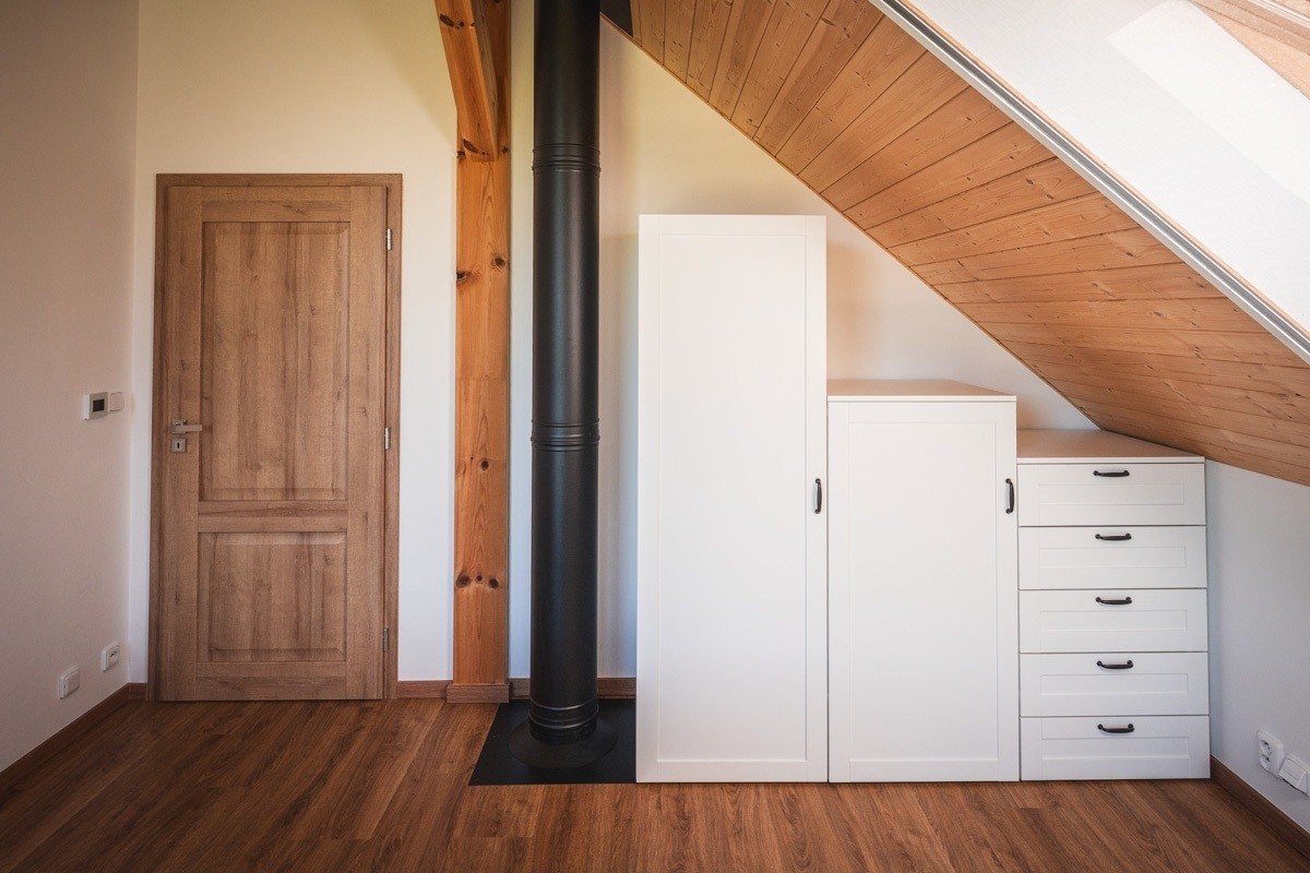 Kouřovod krbu ukazuje, že i v moderní dřevostavbě se vyplatí mít záložní zdroj tepla. Dřevo dokáže během chvíle vyhřát celý interiér a snížit spotřebu elektřiny
