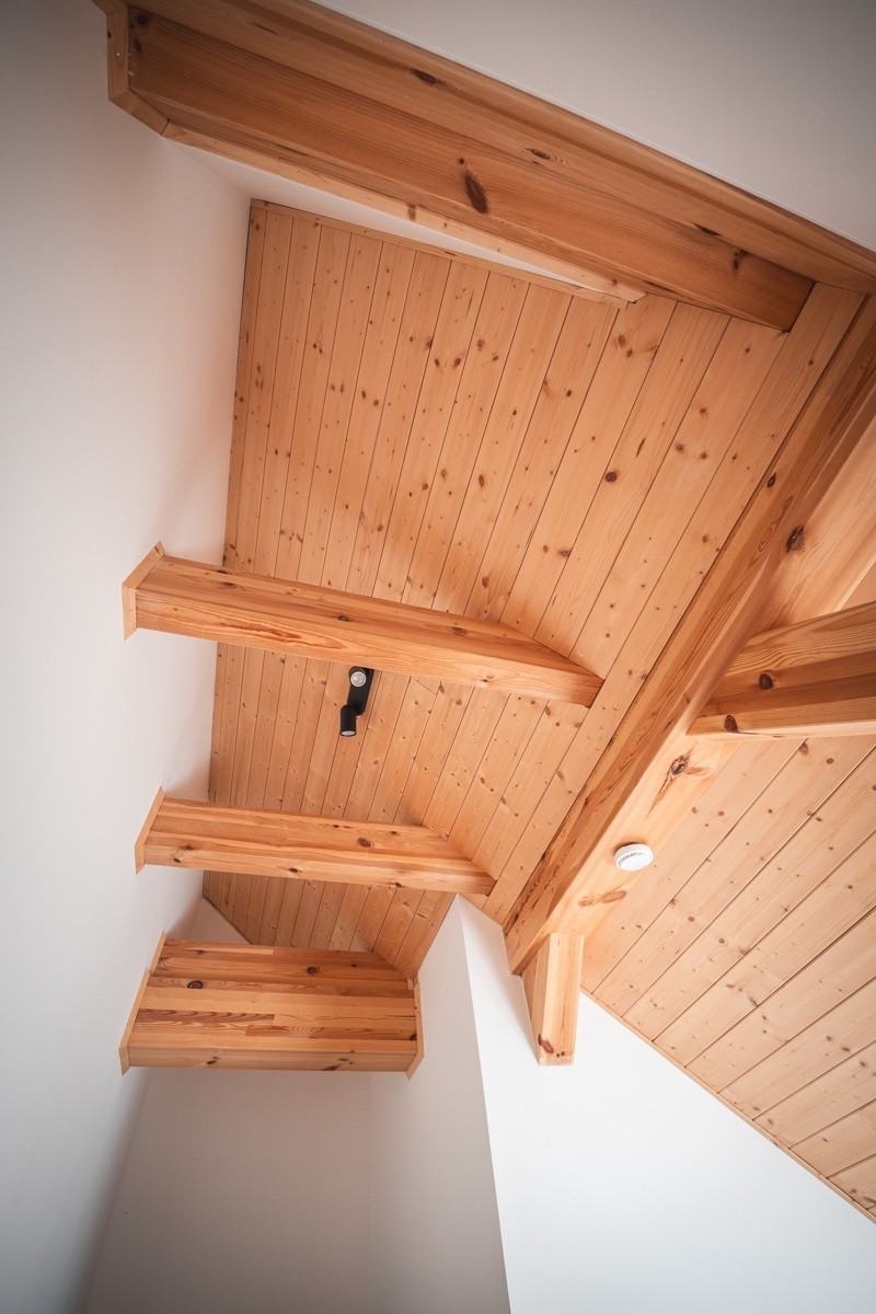 „Chtěli jsme, aby dřevo bylo vidět i uvnitř,“ říká Katka. Strop tak působí přirozeně a dává místnostem útulnou atmosféru