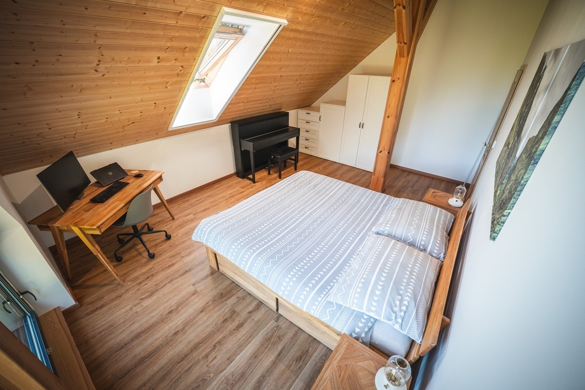 „Nechtěli jsme, aby některý pokoj zůstal nevyužitý,“ vysvětlují majitelé. Proto ložnici v podkroví doplnili o pracovní stůl i piano a vznikl univerzální rodinný prostor
