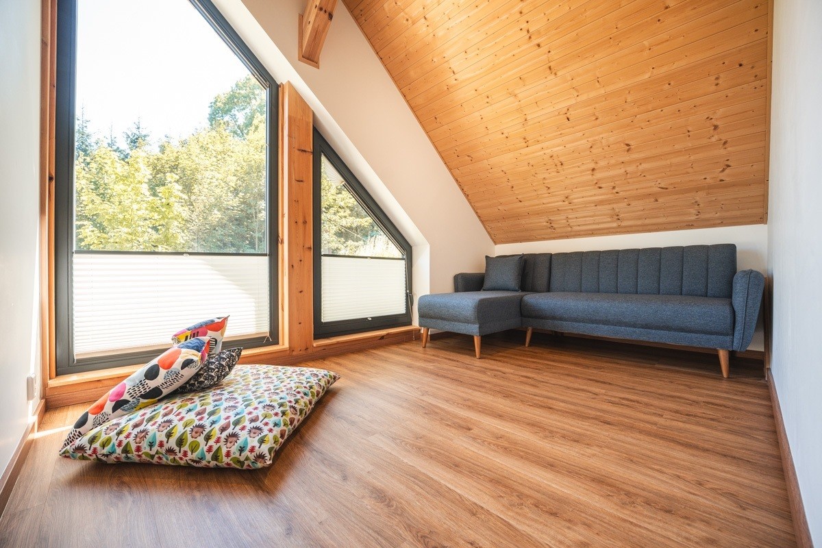 Podkroví slouží jako odpočinková zóna s velkou rohovou sedačkou a výhledem do přírody. Velká šikmá okna propouštějí spoustu světla a propojují interiér s okolím