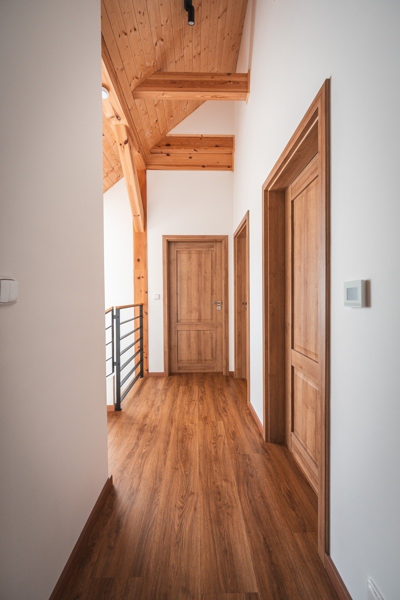 Jednoduchá chodba v patře působí čistě a harmonicky díky sladění podlahy, dveří a dřevěných trámů ve stropě