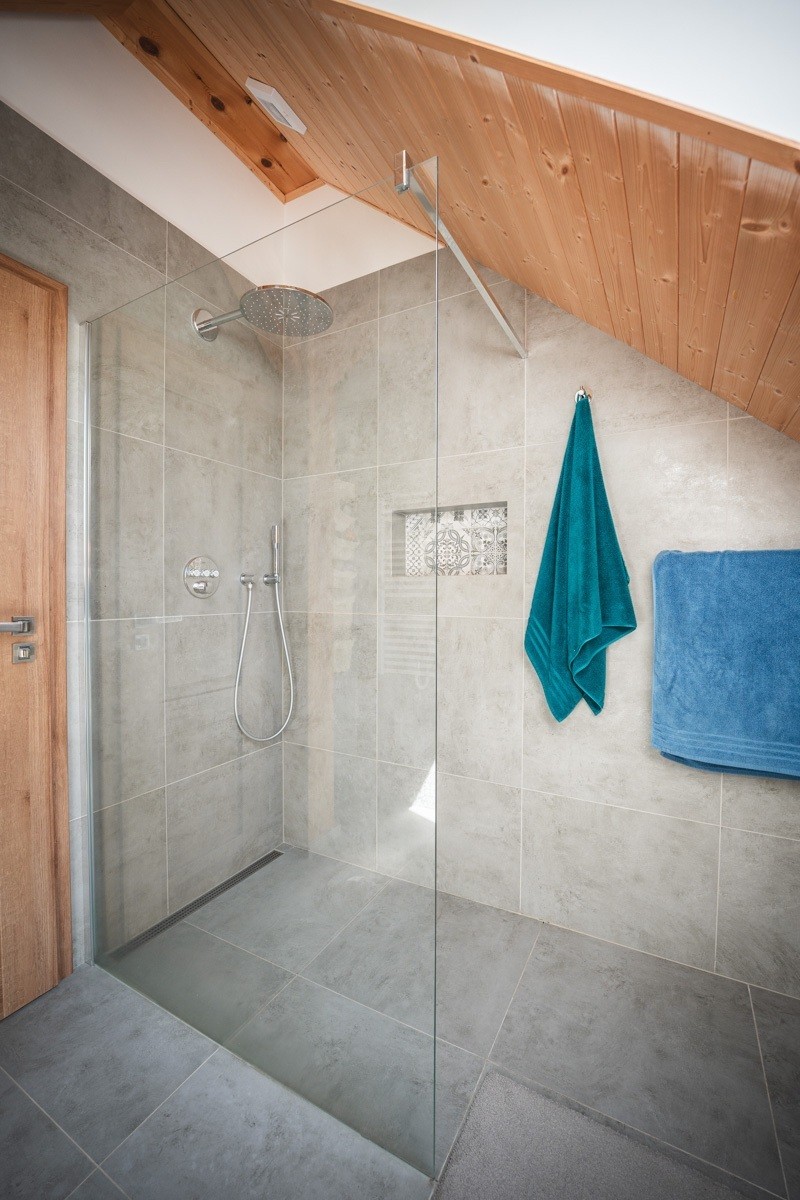 Moderní sprchový kout v podkroví kombinuje čistý design velkoformátových šedých obkladů s přírodním dřevem na stropě