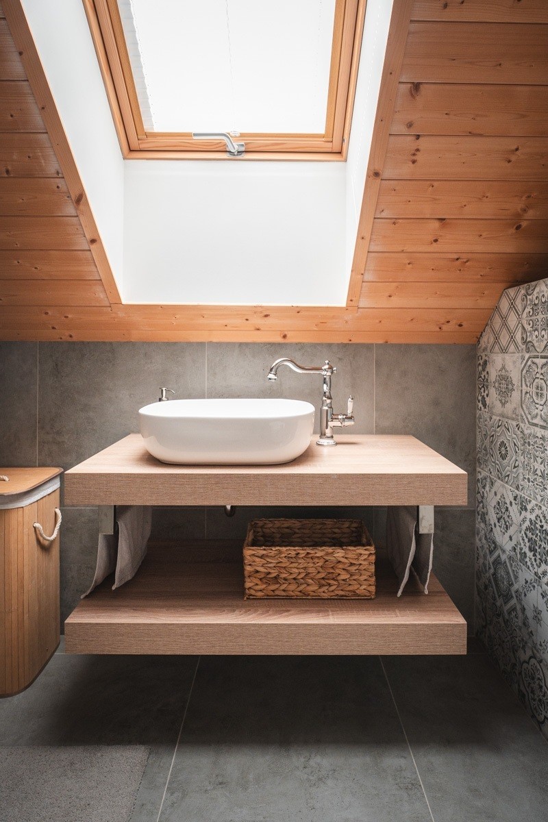 Dřevěný obklad stropu a jednoduchý masivní pult s umyvadlem dodávají prostoru útulnost, zatímco šedé dlaždice a patchworkový obklad na stěně přinášejí moderní kontrast