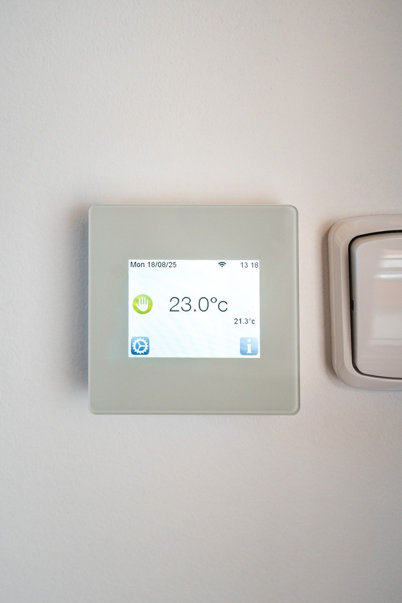 „Podlahové vytápění si nastavíme přes chytrý termostat,“ vysvětluje Mike. Díky tomu mají doma stále příjemných 23 stupňů