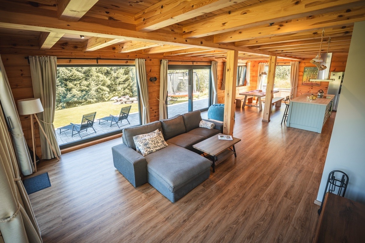 Obývací pokoj je díky proskleným stěnám propojený se zahradou a okolní přírodou. Rodina chtěla místo, kde se všichni mohou potkávat a zároveň mít dostatek prostoru