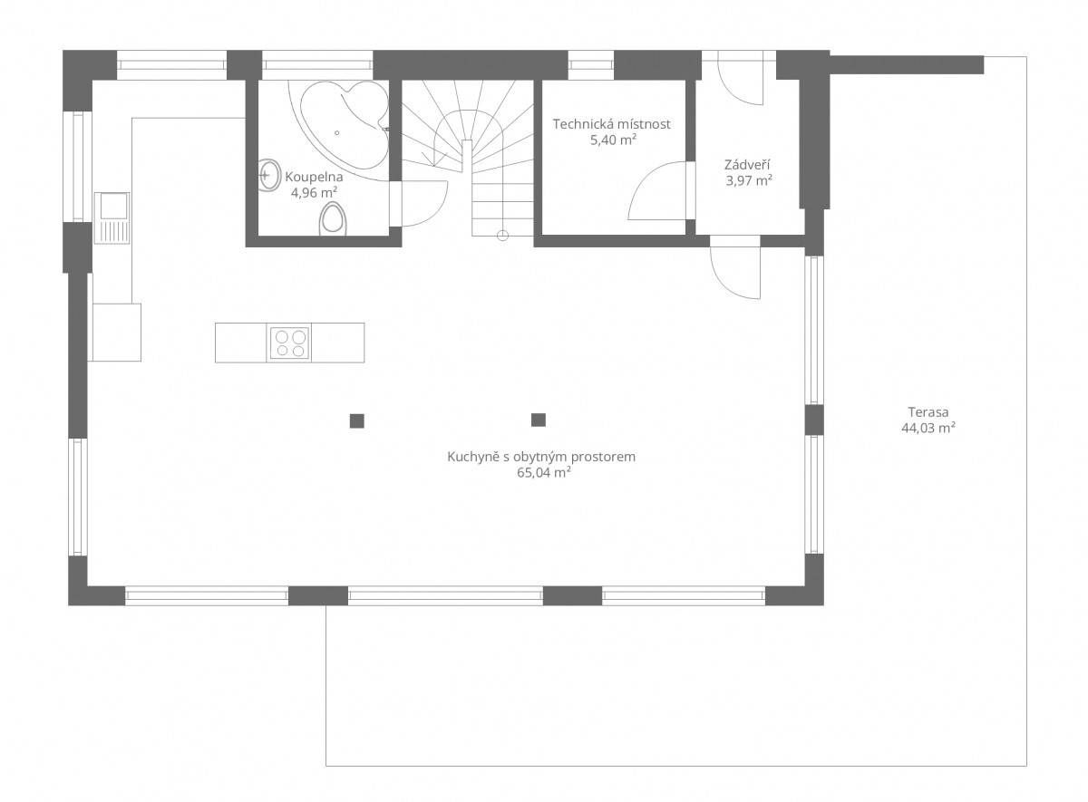 Půdorys patrového rodinného domu s dispozicí 5+kk (přízemí)