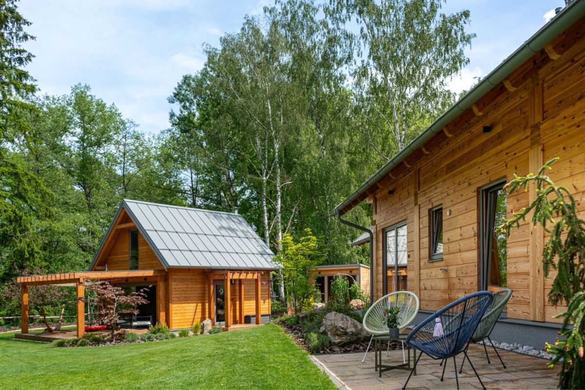 Nechybí tu ani obyvatelný zahradní domek, velká terasa a místa určená k relaxaci jako jsou hamaky i prostor pro děti