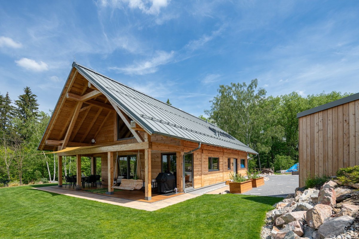 Když se manželé rozhodli postavit svůj vysněný dům, měli několik podmínek. Dům musí být dřevěný, moderní a jelikož mají malé děti, hlavně útulný. Roubenka z lepených hranolů se tak stala jasnou volbou. Už při vstupu do interiéru je jasné, že největší chloubou domu je velkorysý krb, který se stal srdcem celé dřevostavby.