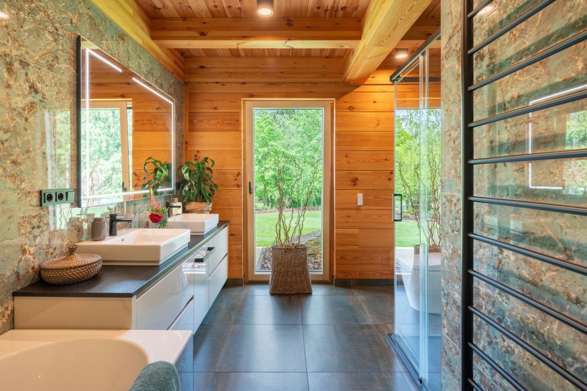 V přízemí se nachází luxusní koupelna s velkými prosklenými okny