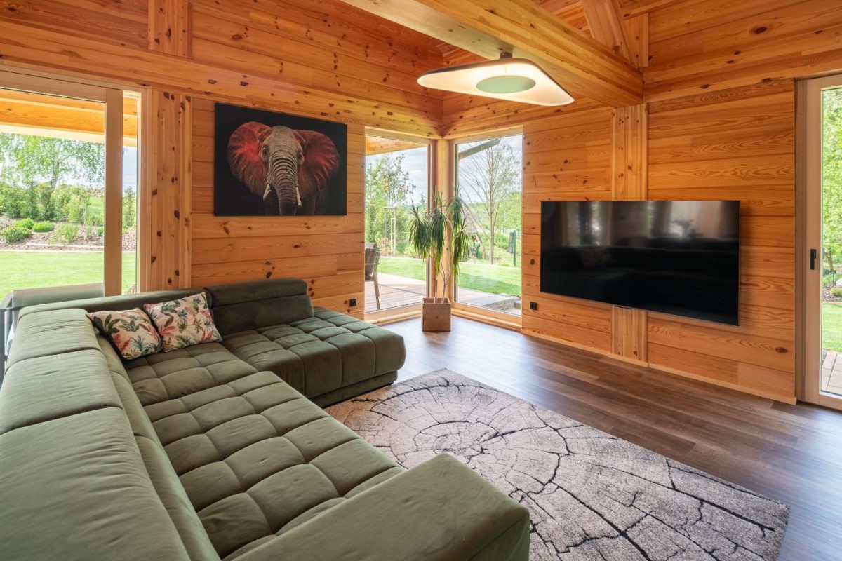 Když se manželé rozhodli postavit svůj vysněný dům, měli několik podmínek. Dům musí být dřevěný, moderní a jelikož mají malé děti, hlavně útulný. Roubenka z lepených hranolů se tak stala jasnou volbou. Už při vstupu do interiéru je jasné, že největší chloubou domu je velkorysý krb, který se stal srdcem celé dřevostavby.