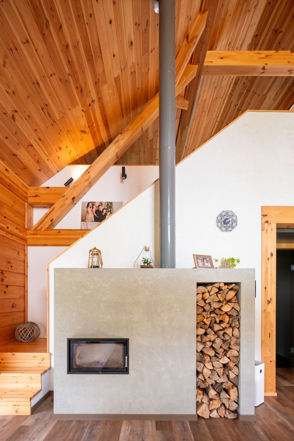 Když se manželé rozhodli postavit svůj vysněný dům, měli několik podmínek. Dům musí být dřevěný, moderní a jelikož mají malé děti, hlavně útulný. Roubenka z lepených hranolů se tak stala jasnou volbou. Už při vstupu do interiéru je jasné, že největší chloubou domu je velkorysý krb, který se stal srdcem celé dřevostavby.