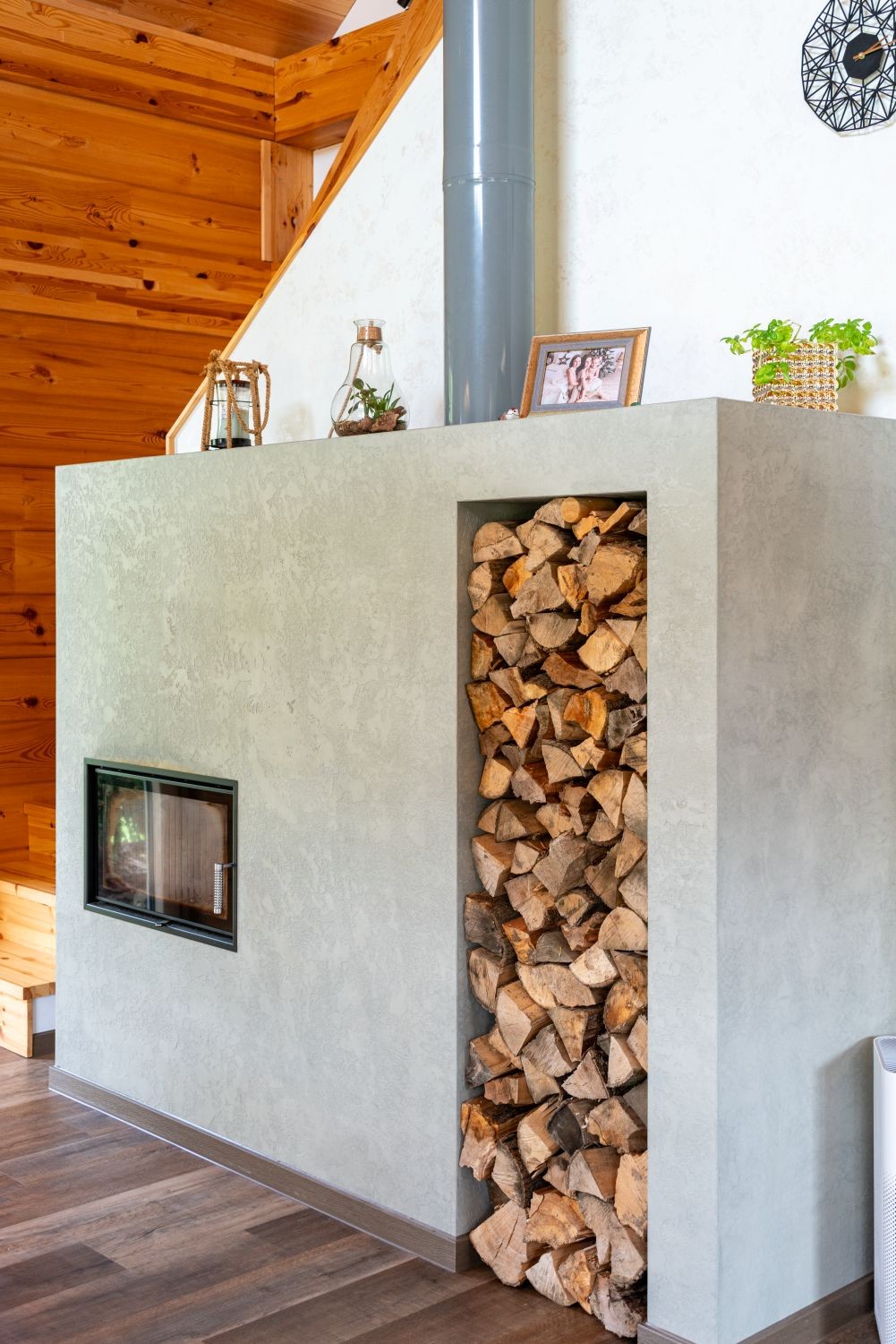 Praktické je i integrované místo na dřevo. Je estetické, funkční a neoddělitelně spojené s celkovým stylem domu